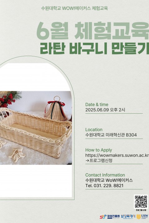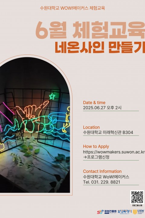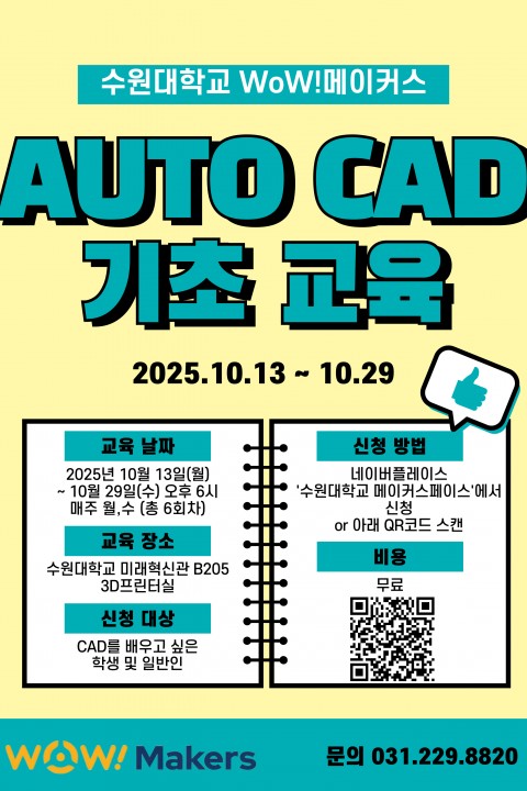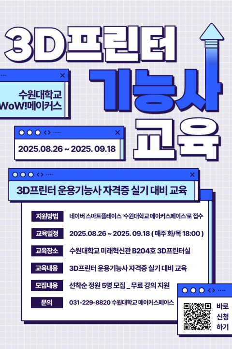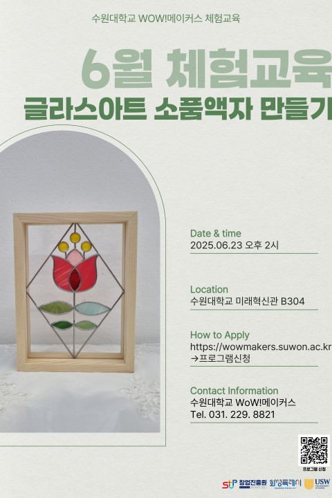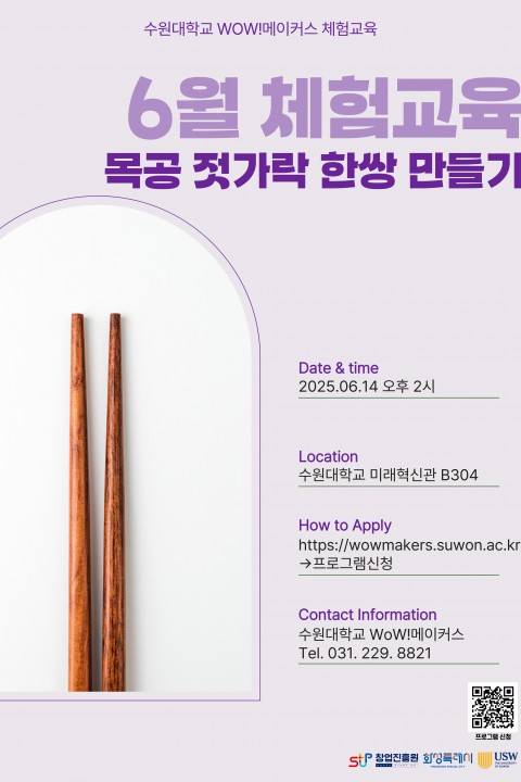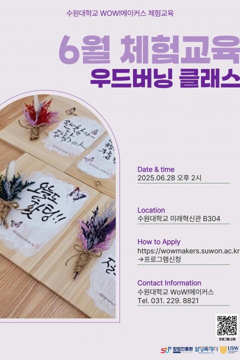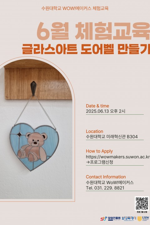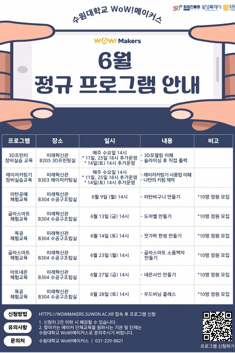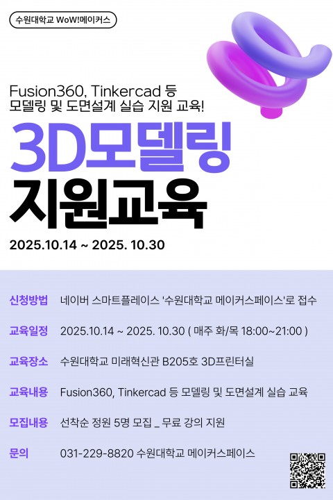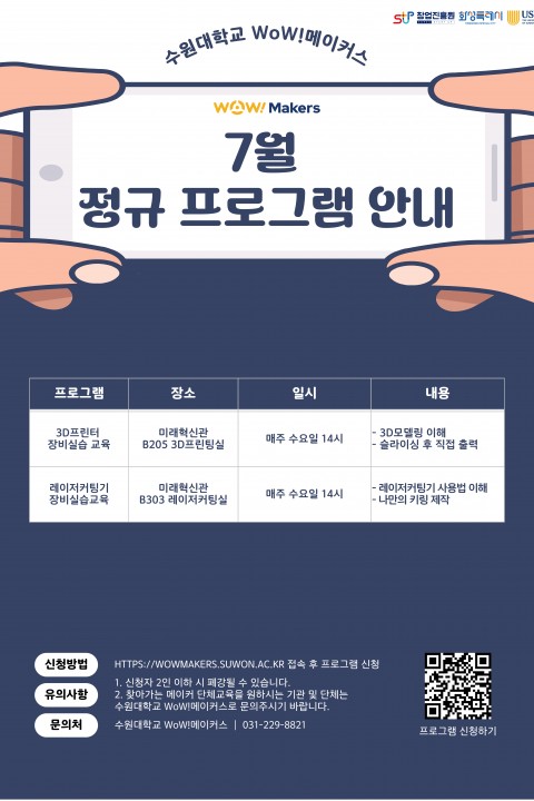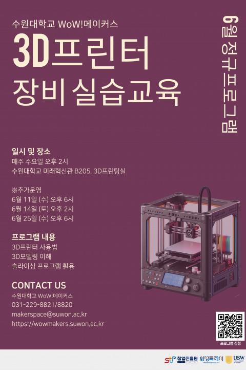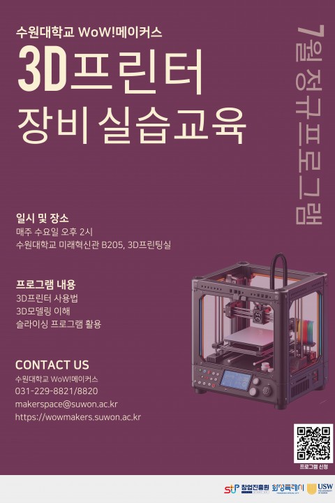 Tel : 031-229-8820 Fax : 031-229-8575 E-mail : makerspace@suwon.ac.kr Address : 경기도 화성시 봉담읍 와우안길 17, 미래혁신관 516호