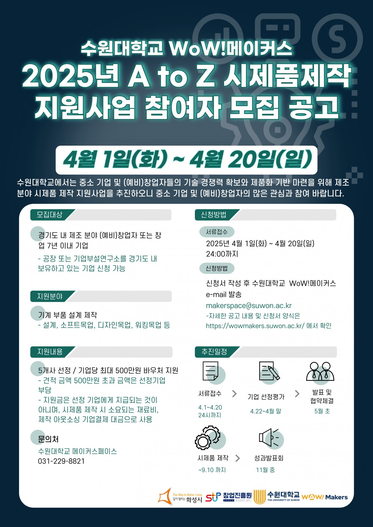 [수원대 WoW!메이커스] 2025년 A to Z 시제품제작 지원사업 참여기업 모집 (~25.4.20)