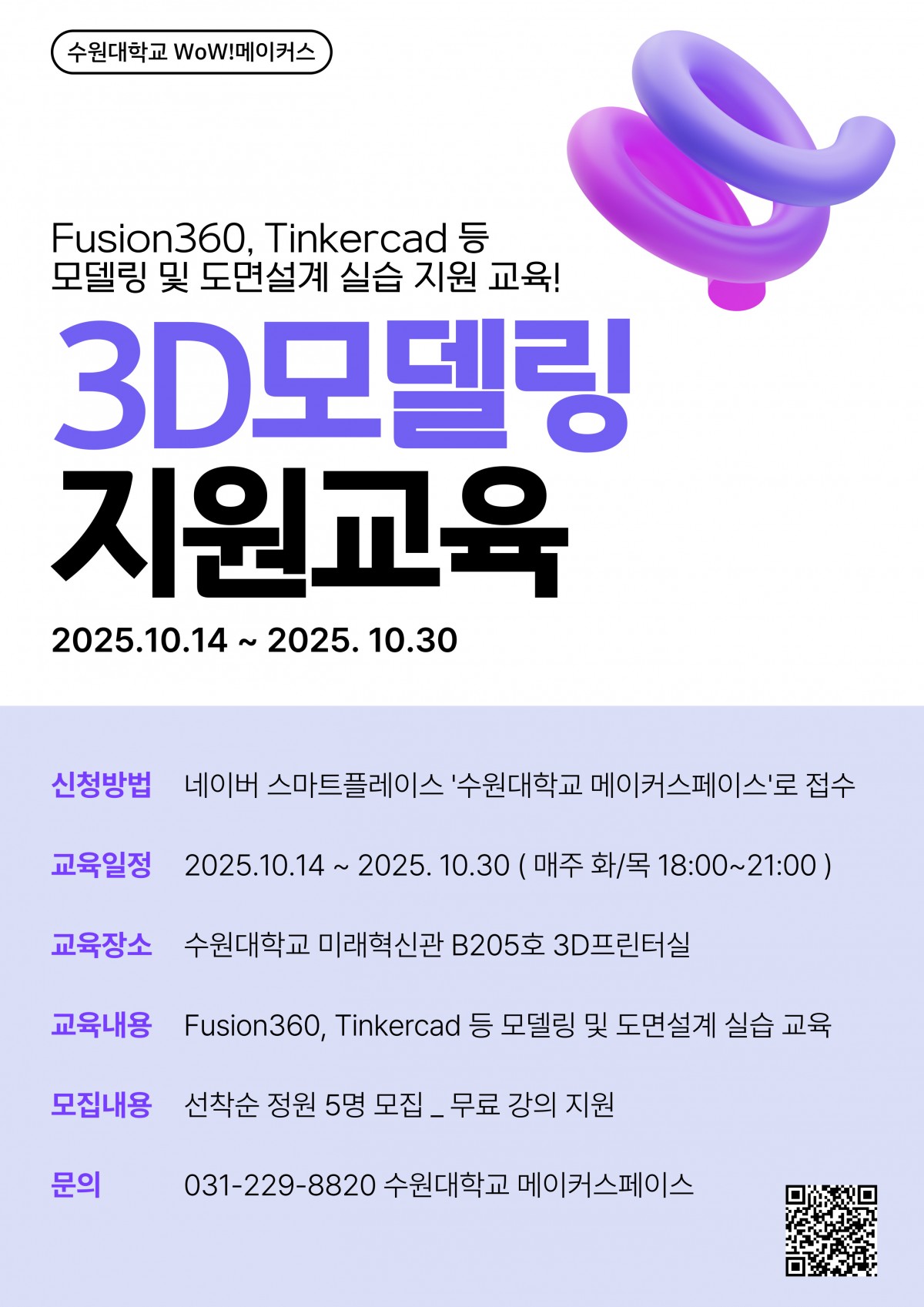 교육기간 2025-10-14~2025-10-30 교육시간 18:00 ~ 21:00 신청기간 2025-09-15~1970-01-01 모집인원 5 교육장소 수원대학교 미래혁신관 B205호 3D프린터실